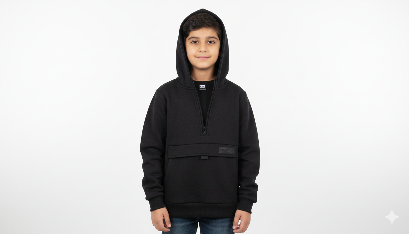 Keep your little one comfy and stylish with this F&F black half-zip hoodie. Designed with a soft, breathable fabric, it’s perfect for school, casual outings, or everyday wear. The quarter-zip front adds convenience, while the cozy hood provides extra warmth.